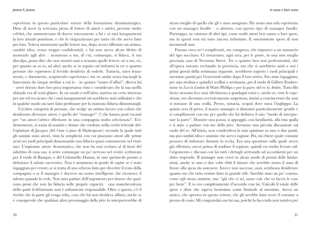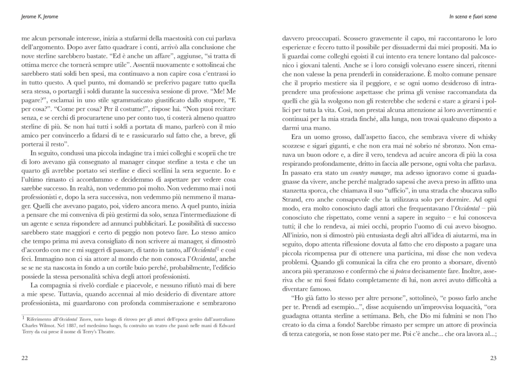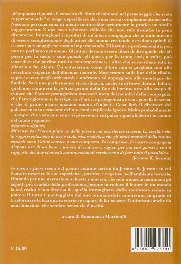 On stage and off es el primer volumen escrito por Jerome K. Jerome en el que el autor describe sus experiencias, positivas y negativas, en el entorno teatral. Optando por una narración franca y sincera, que no deja fuera ni siquiera los aspectos más crueles de la profesión, Jerome introduce al lector en un mundo cuya realidad es muy diferente de la imaginada por el espectador sentado en el patio de butacas. Todo está puntuado por su humor infalible, capaz de transformar una lágrima en una sonrisa y capaz de expresar optimismo incluso en una situación que parece no tener salida. El libro está en lengua italiana.
