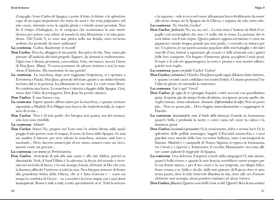 Dramma ed epopea hanno per lui l’unico scopo di fortificare l’arte lirica, come un tonico infuso nel sangue. Quindi è da un punto di vista nuovo che bisogna esaminare i drammi – quattro finora – che Verhaeren ha composto al di fuori della sua opera, e cioè da quello della costruzione quasi esclusivamente architettonica.