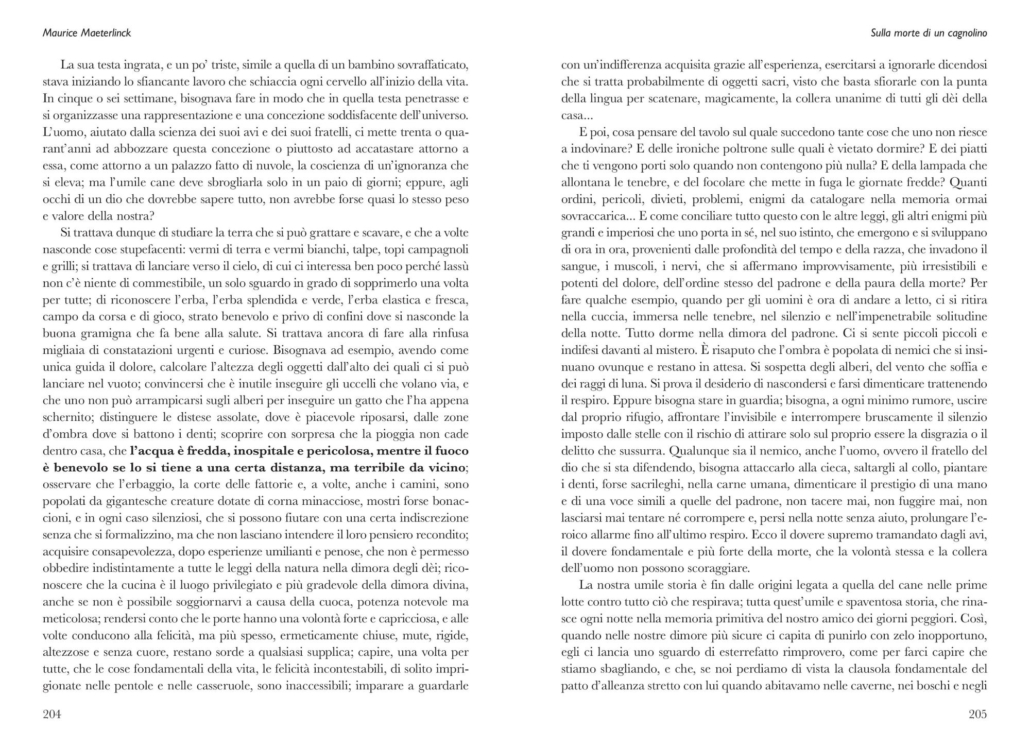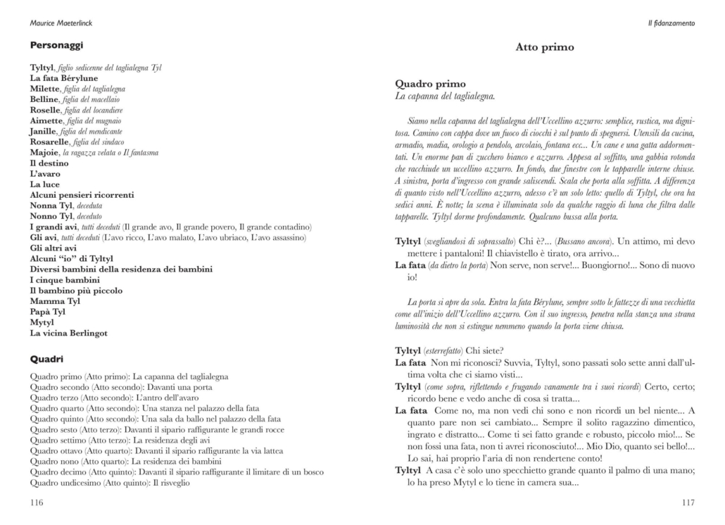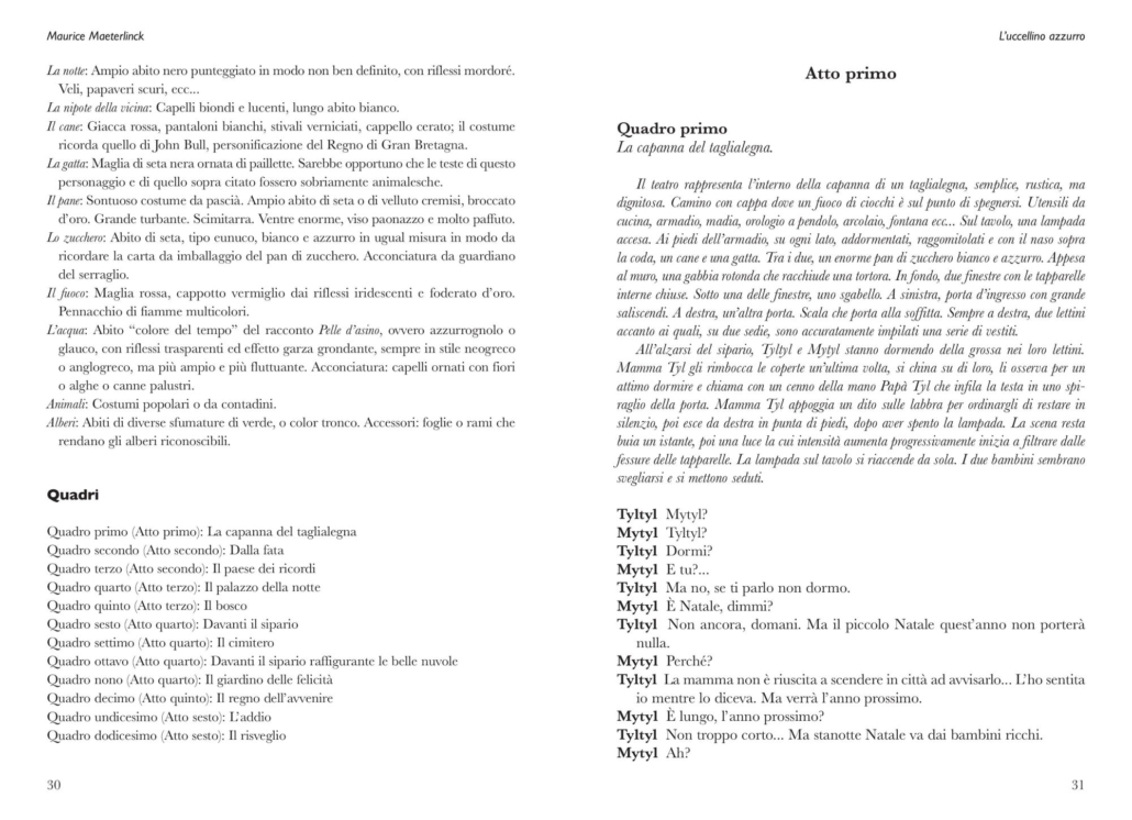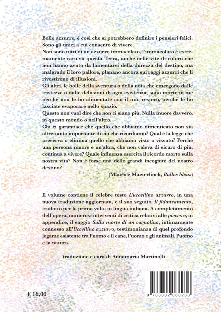 Il volume contiene il celebre testo L’uccellino azzurro, in una nuova traduzione aggiornata, e il suo seguito, Il fidanzamento, tradotto per la prima volta in lingua italiana. A completamento dell’opera, numerosi interventi di critica relativi alle pièces e, in appendice, il saggio Sulla morte di un cagnolino, intimamente connesso all’Uccellino azzurro, testimonianza di quel profondo legame esistente tra l’uomo e il cane, l’uomo e gli animali, l’uomo e la natura.